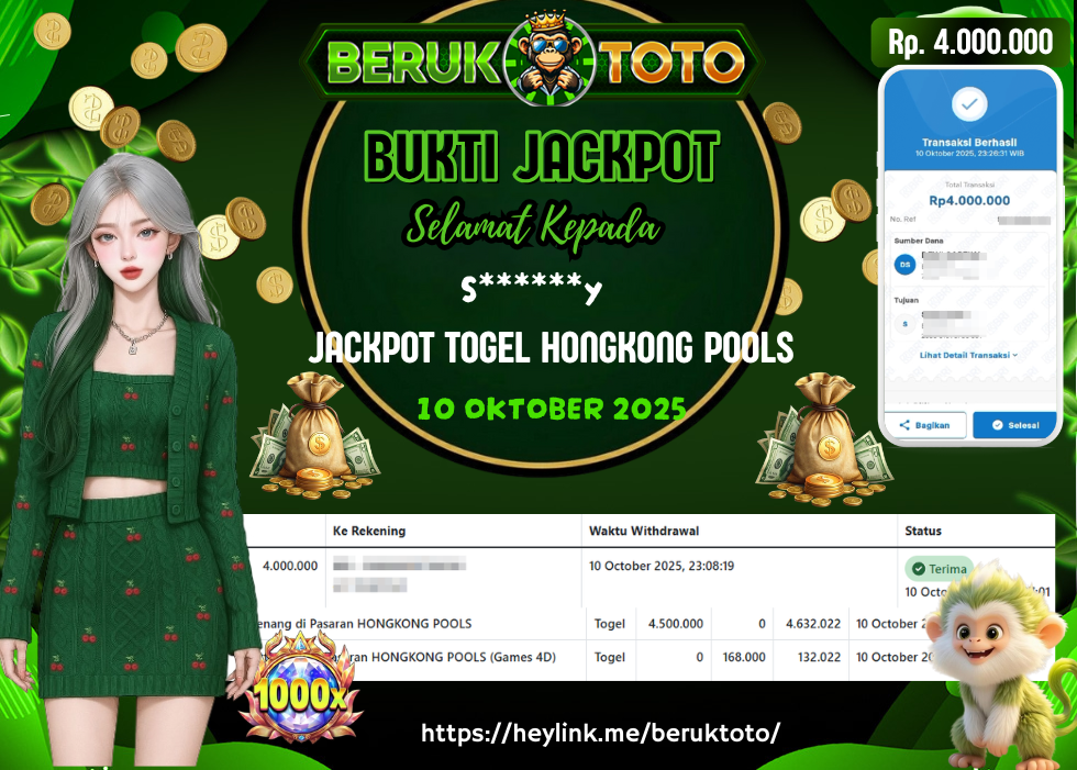 SELAMAT kepada Mr. S Telah menang dalam permainan JACKPOT TOGEL HONGKONG POOLS Rp.4.000.000,- Setelah mengisi formulir withdraw dengan hanya dalam waktu 5 - 10 Menit langsung di transfer ke rekening yang terdaftar. Bukti pembayaran ini adalah bukti yang Valid dan dapat di Pertanggung Jawabkan.