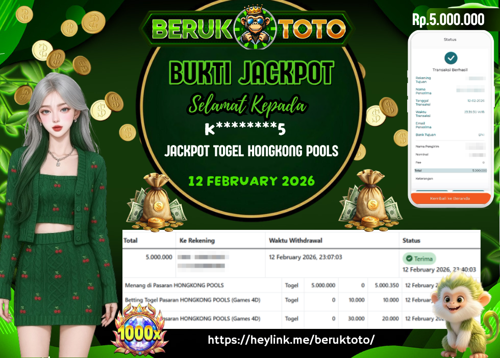 SELAMAT kepada Mr. L Telah menang dalam permainan JACKPOT TOGEL HONGKONG POOLS Rp.5.000.000,- Setelah mengisi formulir withdraw dengan hanya dalam waktu 5 - 10 Menit langsung di transfer ke rekening yang terdaftar. Bukti pembayaran ini adalah bukti yang Valid dan dapat di Pertanggung Jawabkan.