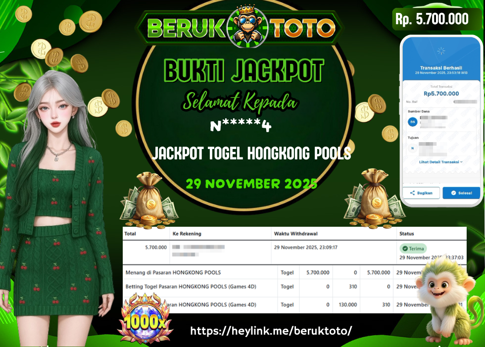 SELAMAT kepada Mr. N Telah menang dalam permainan JACKPOT TOGEL HONGKONG POOLS Rp.5.700.000,- Setelah mengisi formulir withdraw dengan hanya dalam waktu 5 - 10 Menit langsung di transfer ke rekening yang terdaftar. Bukti pembayaran ini adalah bukti yang Valid dan dapat di Pertanggung Jawabkan.