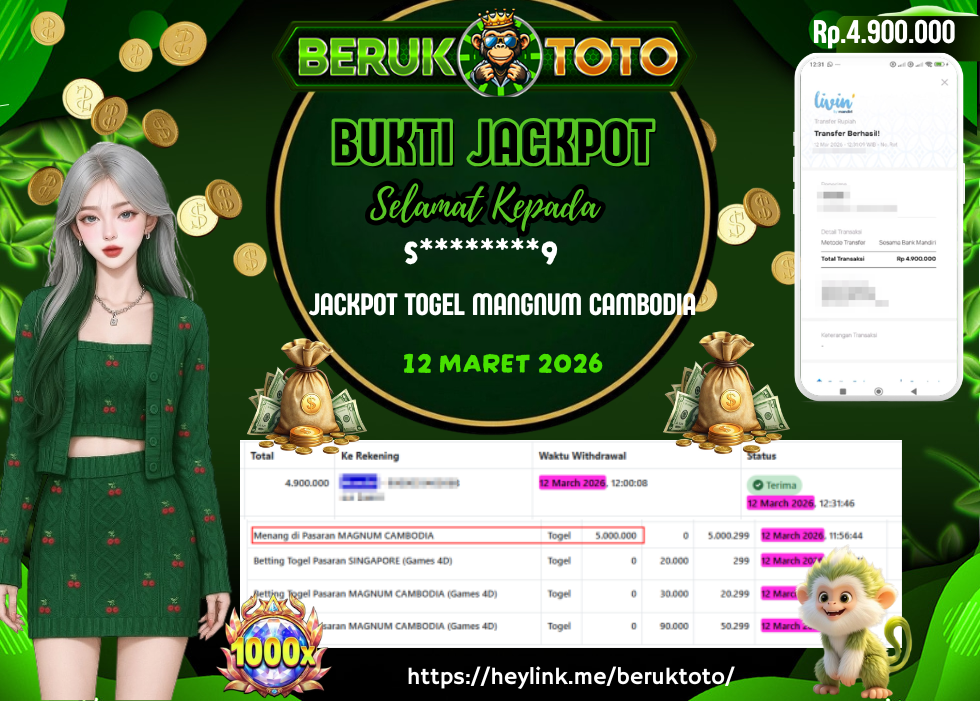 SELAMAT kepada Mr. S Telah menang dalam permainan JACKPOT TOGEL MANGNUM CAMBODIA Rp.4.900.000,- Setelah mengisi formulir withdraw dengan hanya dalam waktu 5 - 10 Menit langsung di transfer ke rekening yang terdaftar. Bukti pembayaran ini adalah bukti yang Valid dan dapat di Pertanggung Jawabkan.