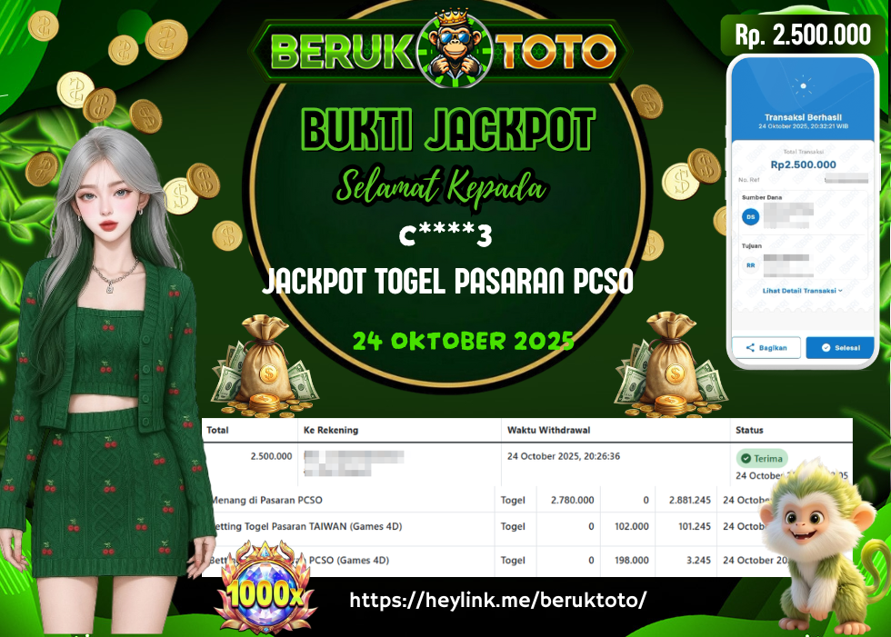 SELAMAT kepada Mr. R Telah menang dalam permainan JACKPOT TOGEL PCSO Rp.2.500.000,- Setelah mengisi formulir withdraw dengan hanya dalam waktu 5 - 10 Menit langsung di transfer ke rekening yang terdaftar. Bukti pembayaran ini adalah bukti yang Valid dan dapat di Pertanggung Jawabkan.