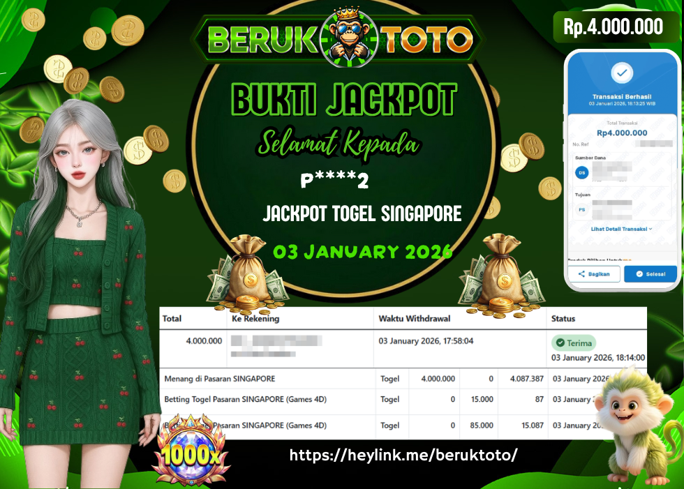 SELAMAT kepada Mr. P Telah menang dalam permainan JACKPOT TOGEL SINGAPORE Rp.4.000.000,- Setelah mengisi formulir withdraw dengan hanya dalam waktu 5 - 10 Menit langsung di transfer ke rekening yang terdaftar. Bukti pembayaran ini adalah bukti yang Valid dan dapat di Pertanggung Jawabkan.