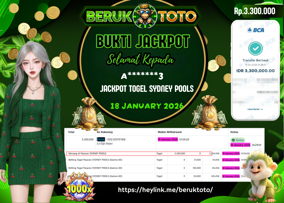 SELAMAT kepada Mr. A Telah menang dalam permainan JACKPOT TOGEL SYDNEY POOLS Rp.3.300.000,- Setelah mengisi formulir withdraw dengan hanya dalam waktu 5 - 10 Menit langsung di transfer ke rekening yang terdaftar. Bukti pembayaran ini adalah bukti yang Valid dan dapat di Pertanggung Jawabkan.
