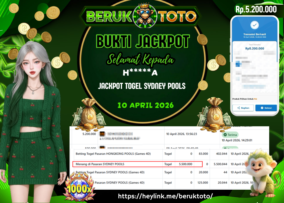 SELAMAT kepada Mr. H Telah menang dalam permainan JACKPOT TOGEL SYDNEY POOLS Rp.5.200.000,- Setelah mengisi formulir withdraw dengan hanya dalam waktu 5 - 10 Menit langsung di transfer ke rekening yang terdaftar. Bukti pembayaran ini adalah bukti yang Valid dan dapat di Pertanggung Jawabkan.