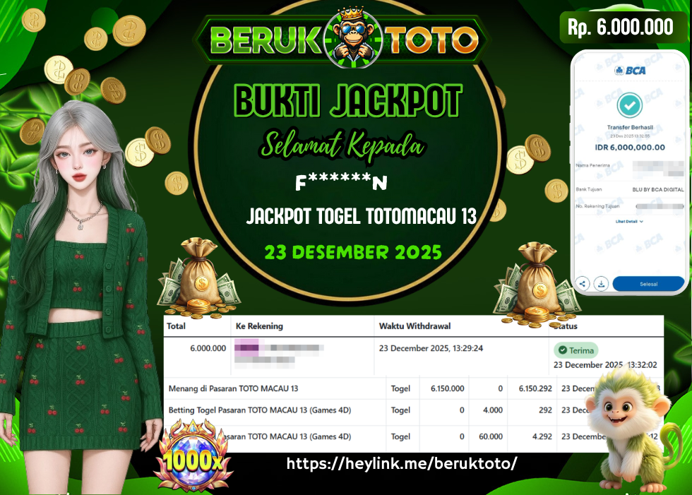 SELAMAT kepada Mr. F Telah menang dalam permainan JACKPOT TOGEL TOTOMACAU 13 Rp.6.000.000,-Setelah mengisi formulir withdraw dengan hanya dalam waktu 5 - 10 Menit langsung di transfer ke rekening yang terdaftar. Bukti pembayaran ini adalah bukti yang Valid dan dapat di Pertanggung Jawabkan.