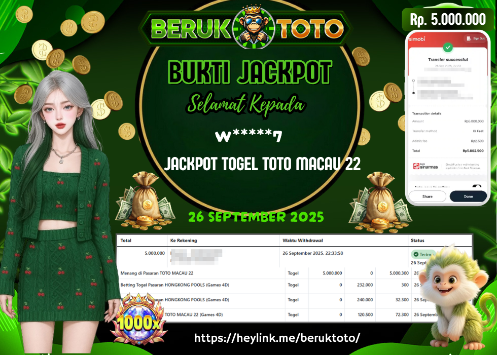 SELAMAT kepada Mr. Y Telah menang dalam permainan JACKPOT TOGEL TOTOMACAU 22 Rp.5.000.000,- Setelah mengisi formulir withdraw dengan hanya dalam waktu 5 - 10 Menit langsung di transfer ke rekening yang terdaftar. Bukti pembayaran ini adalah bukti yang Valid dan dapat di Pertanggung Jawabkan.